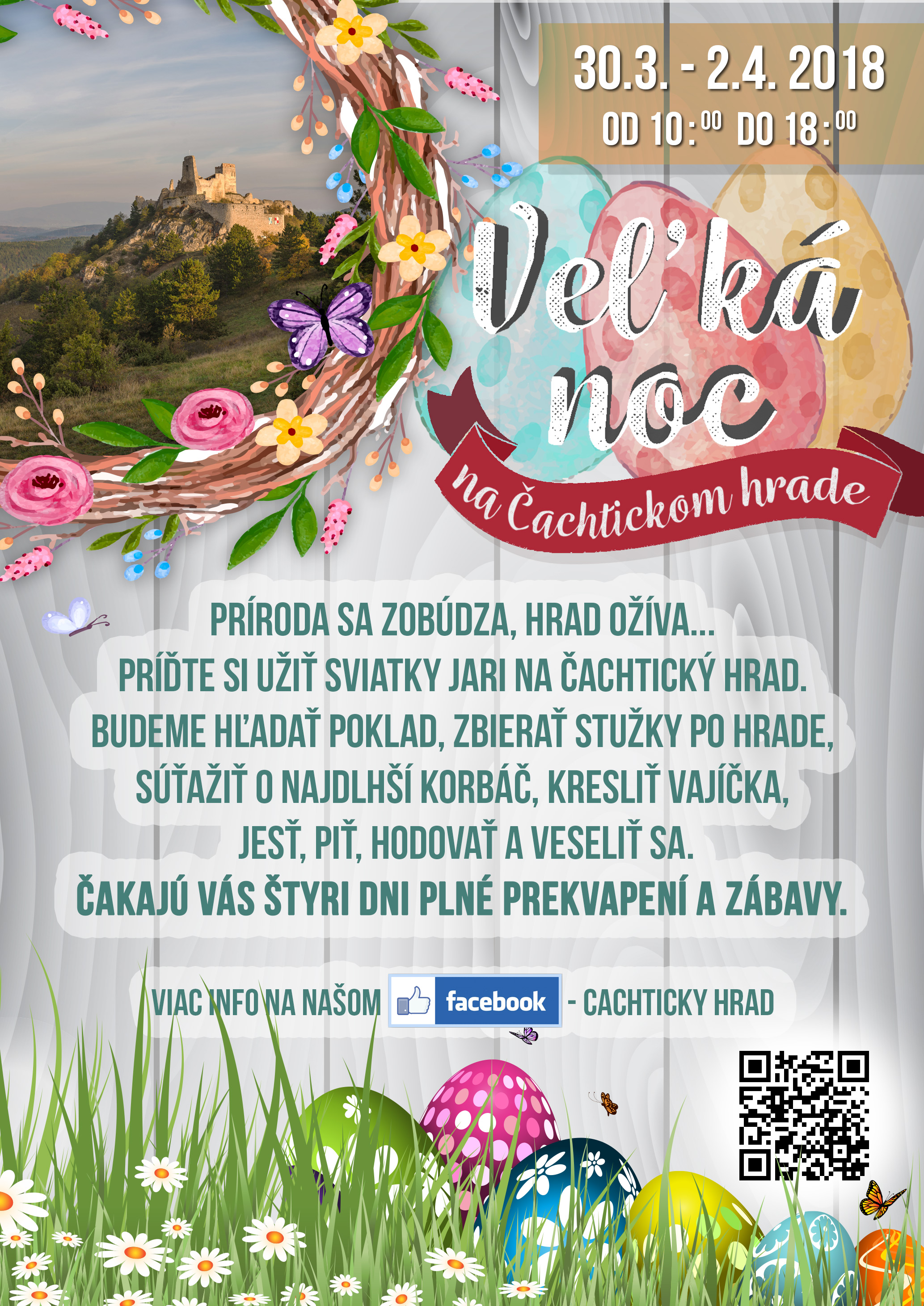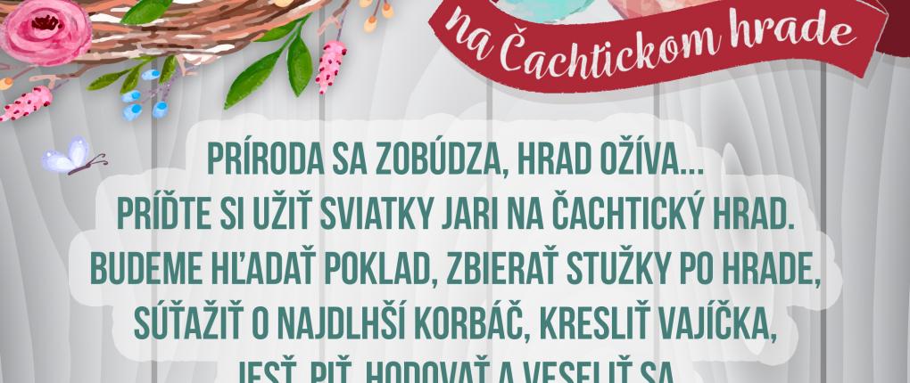 Príďte si užiť sviatky jari na Čachtický hrad. Okrem tradičných veľkonočných zvykov a historického remeselného jarmoku na vás čakajú aj rôzne zábavné aktivity pre deti i dospelých. Bude sa hľadať poklad, zbierať stužky či súťažiť o najdlhší korbáč. Nebude chýbať ani hraný veľkonočný príbeh pre zvedavé deti o Báthoryčke a jej veľkonočnom kúpaní, ktorý sa odohrá každý deň o 12.00; 14.00 a 16.00 h. Bližšie informácie o podujatí nájdete na priloženom plagáte.