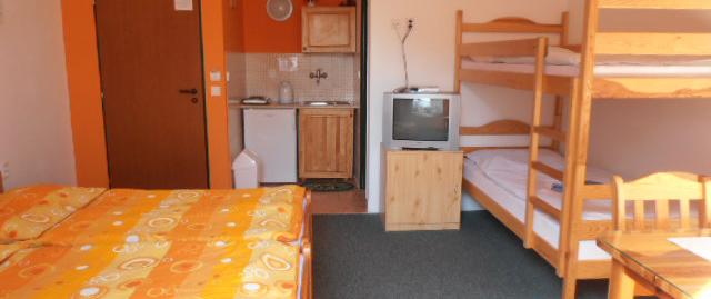 ⇥⇥Na izbách sa nachádza vlastné sociálne zariadenie (kúpeľňa, WC, sprcha), kompletná kuchynka, chladnička a TV. Interiér je vkusne vybavený novým dreveným nábytkom a doplnkami, ktoré tvoria príjemnú atmosféru pre oddych v našom penzióne.