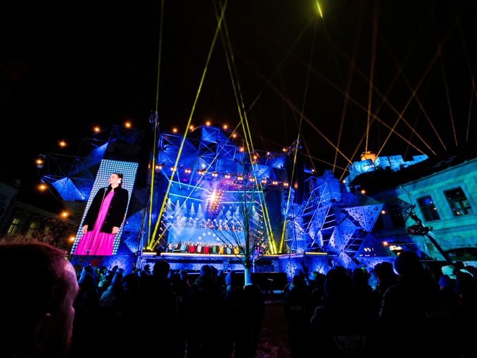 Večerný galaprogram priniesol umelecké spojenia hudobných hviezd s jedinečným talentom mesta a regiónu, ktoré projekt Trenčín 2026 predstavil nielen domácemu publiku, ale aj medzinárodným divákom. Na pódiu sa predstavili Jana Kirschner a Štefan Štec s Vojenskou hudbou Banská Bystrica, legendárna trenčianska skupina Bez ladu a skladu v spojení s dychovou hudbou Lucerka, Nina Kohout, ako aj Emma Drobná s Martinom „Majlom“ Štefánikom v umeleckej performance v choreografii Kataríny Čillikovej, inšpirovanej Trenčínom ako mestom módy.