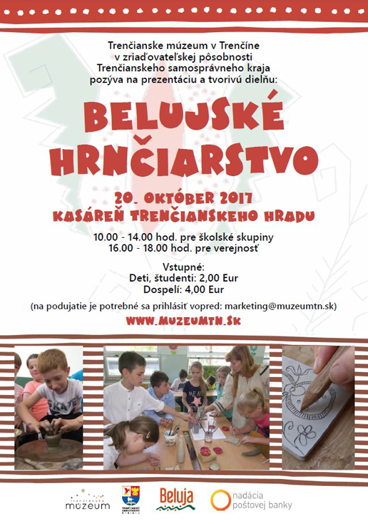 Trenčianske múzeum v Trenčíne, in the founding area of Trenčiansky samosprávny kraj, prepared an interesting workshop called "Belujské hrnčiarstvo" on Friday 20 October 2017. Participants will be presented a pottery workshop from the village of Beluj through a short film projection with expert commentary. Part of the event will be a demonstration of the traditional process of shaping the vessel on the potter's circle as well as a practical part where visitors will be able to produce their own pottery clay objects. You can find more information about the event on the attached poster.