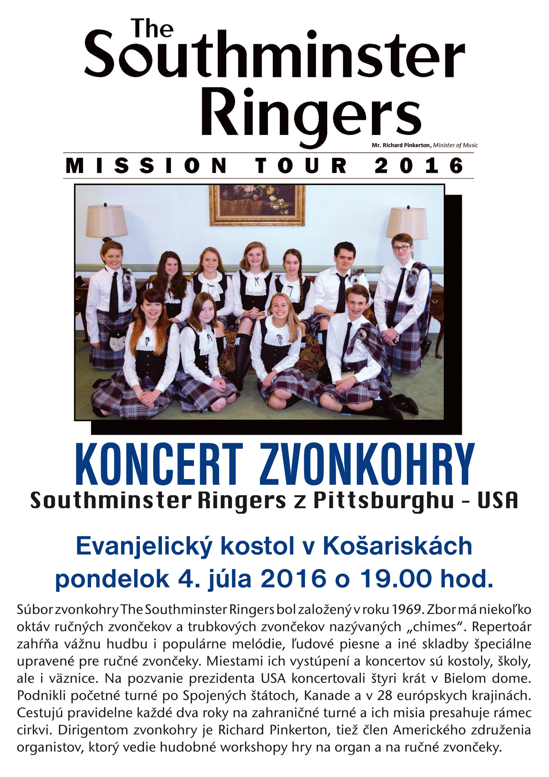 A harangjáték Southminster Ringer Pittsburgh két év után ismét jön Košarisko. Abból az alkalomból, az európai turné lesz a lehetőséget, hogy hallja kiemelkedő zenei csoport, amely elvégzi a hétfő, július 4, 2016 at 19:00 h evangélikus templom Košariskách. Hangversenykórus meghívja Vallási Košariská - oszd meg és közösség Košariská.